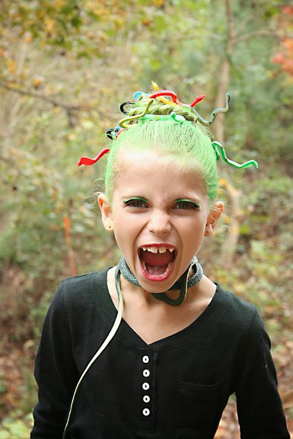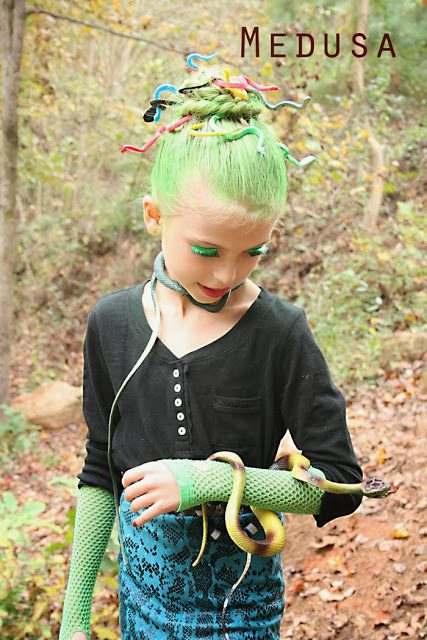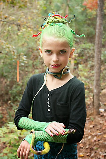 We love dressing up for Halloween and my kids never have a problem figuring out what they want to be.  Chloe is the only child that will still let ME make the costume decision.  I think next year I’ll have no luck with her though, and she’ll be telling me what she wants to be.  Stella made her costume this year.  She came up with the Medusa costume from looking through a Martha Stewart Halloween magazine.  She is learning how to sew and making costumes is a perfect learning ground.  I found the “snake skin” fabric at JoAnns and with help she sewed a simple pencil skirt.  Chloe’s woodland fairy costume also came from Martha Stewart’s Halloween magazine special.  My favorite part of her costume is the butterfly net.