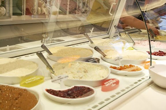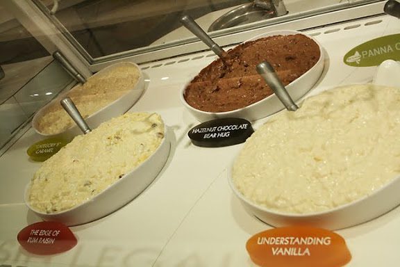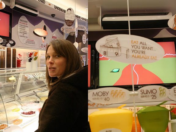 When my girlfriend Katie was in town, we spent a day in the city. Her number one request was to eat sushi and we stuffed ourselves with yummy rolls. After I took her to Rice to Riches, which is a dessert place that sells only rice pudding. I’d heard how the thick and rich the pudding is, and I was not disappointed. My mouth waters when I think about the coconut pudding I ordered and I want to go back and try the french toast flavor. They have really funny marketing signs that basically says that their pudding will get you fat.